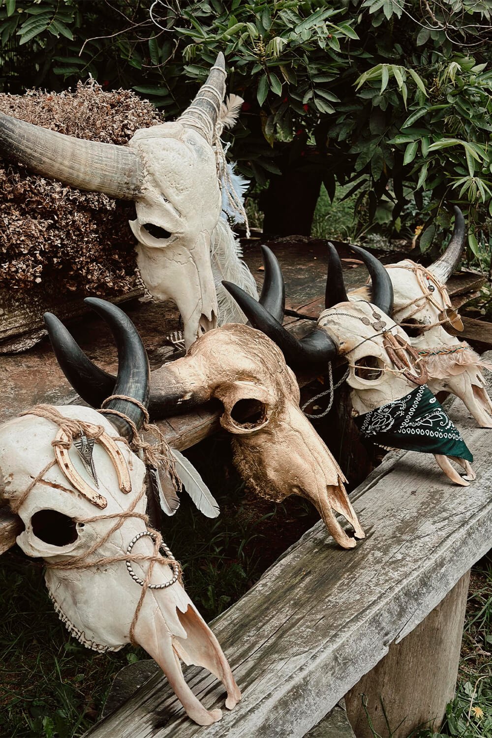 Cráneos de toro decorados y naturales. Piezas únicas llenas de arte y magia que llenan cualquier espacio de protección y de autenticidad. Decoradas con pizas llenas de sentido e intención.